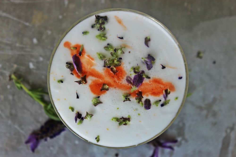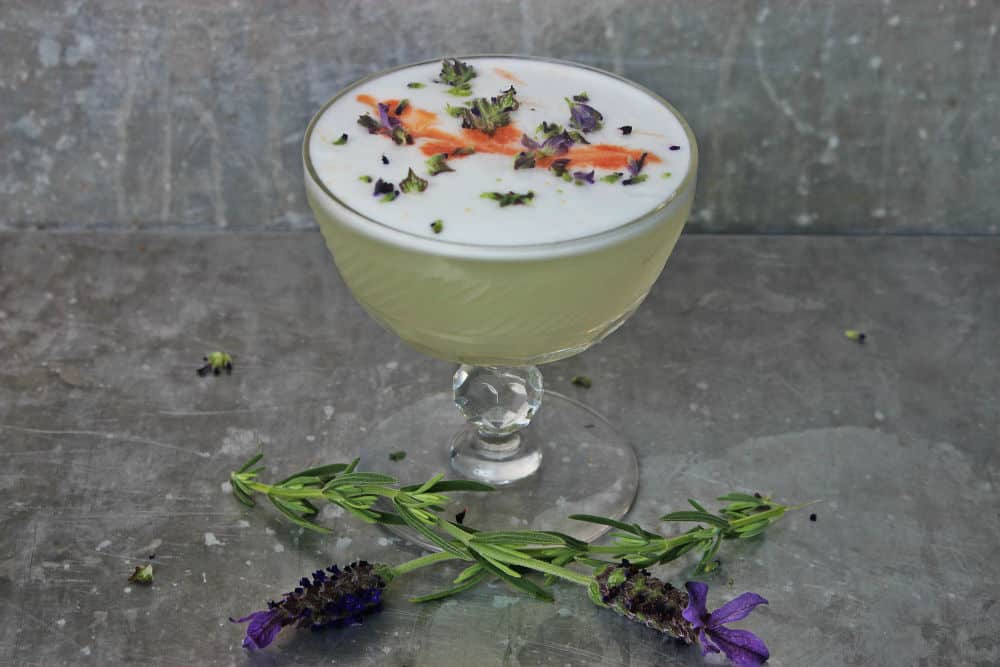 - In a cocktail shaker combine gin, lavender simple syrup, and egg white