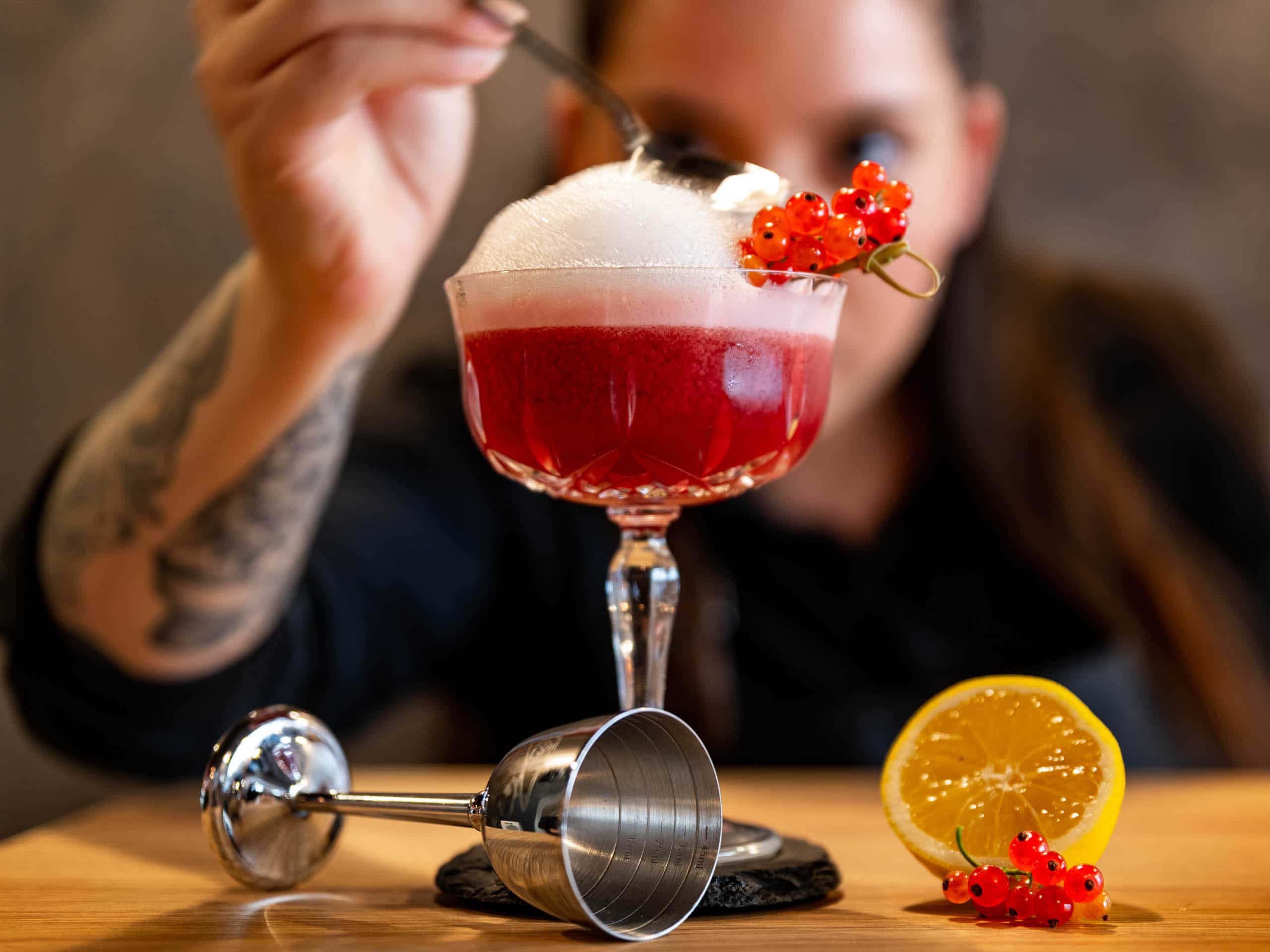 When you have muddled your cocktail ingredients, you can add and shake whole spices. Double straining is the process to ensure that you will have a clear result. There will be no floating particles by double straining the cocktail.
