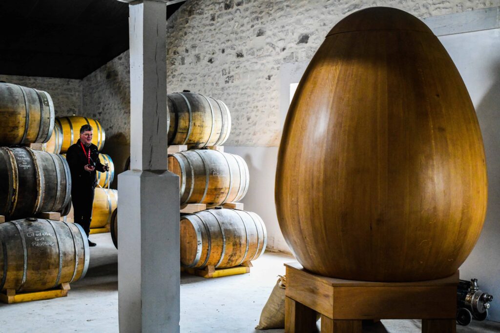 After a quick photo op, and with our glasses in hand, we made our way out to a side building on the property, of which there are many, but this one was special. What makes this one special you ask? This is where Citadelle Gin comes to life using their one of a kind patented infusion method, followed by 5 months of aging in 6 different types of casks and finally everything is harmoniously blended together to perfection in an oversized wooden egg; yup, an egg. There is of course method to this madness and the giant wooden egg is an unusual sight to behold when walking into any aging warehouse, however this method of blending is proven and is used in different methods of production all around the world. Actually, the first time we saw this was in Argentina at a number of prominent wineries such as Susan Balboa and Casa de Uco.