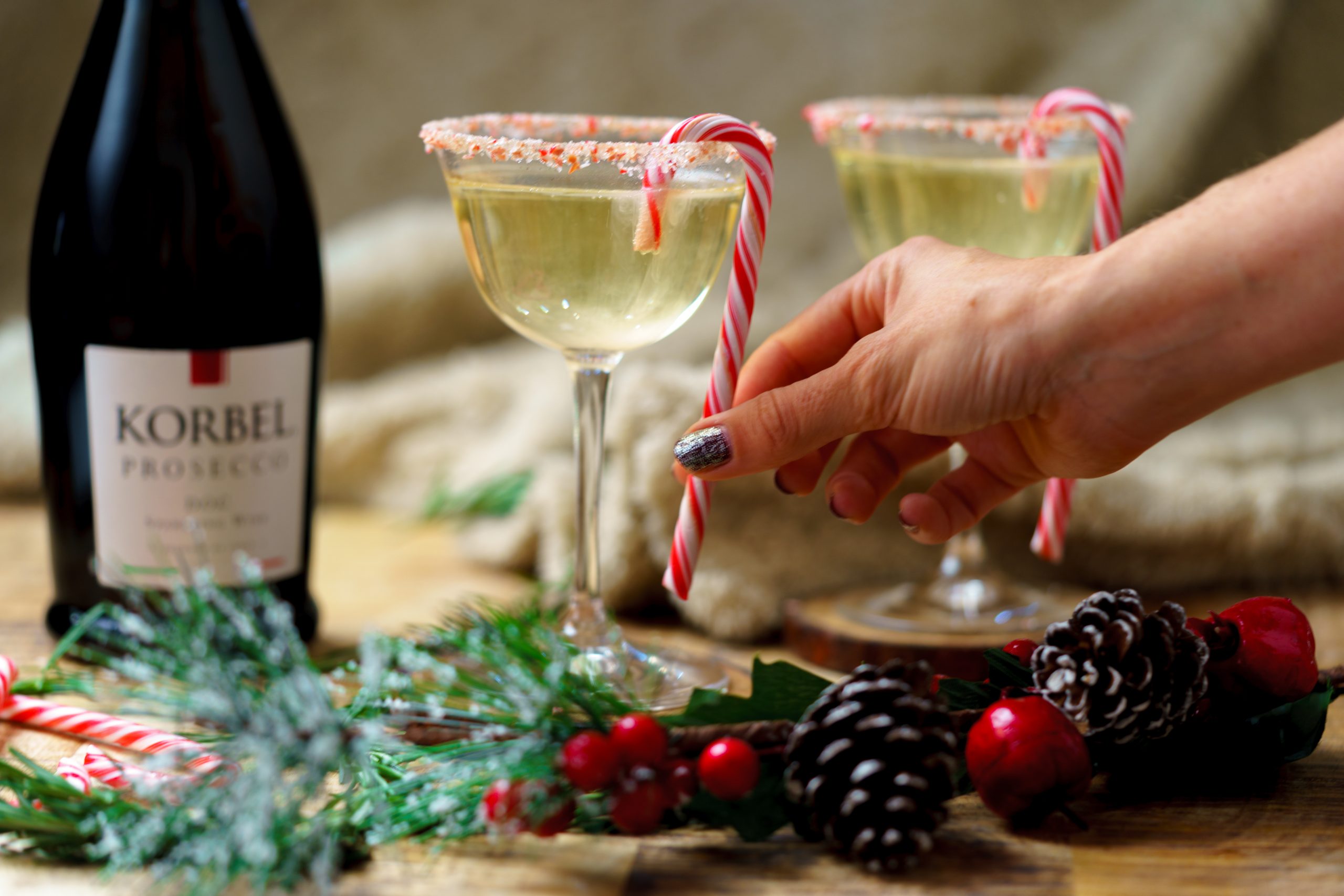 Korbel Prosecco has some deliciously tangy bubbles, and a touch of Vanilla was just the simplest thing I could think of that would add a delicious accentuating flavor to the mix. Obviously, I really wanted to get festive, so I crushed up a candy cane for the rim, so as you’re sipping these delectable bubbles, the first thing you taste is fresh and minty.