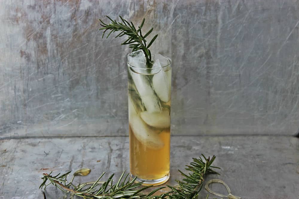 - In a cocktail shaker combine lemon juice, club soda, rosemary leaves, agave and ice.