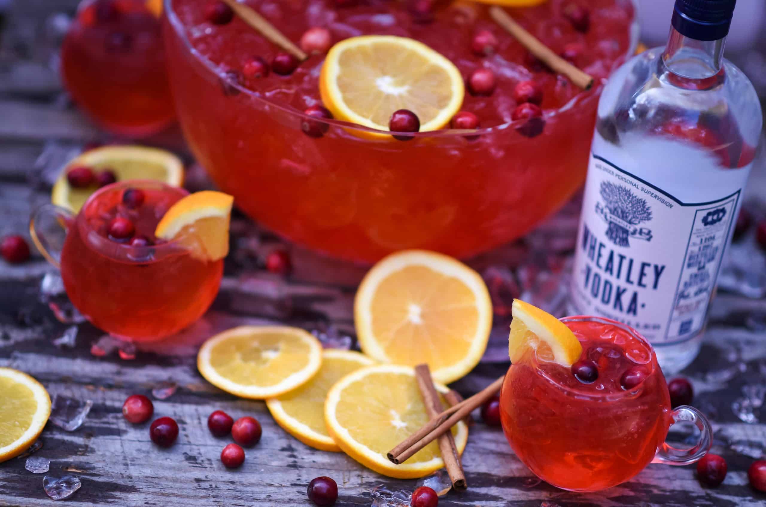 This cocktail was inspired by the classic cranberry and vodka cocktail but I made it into a punch with festive ingredients like cranberry juice, champagne, and cinnamon syrup. It’s super easy to make when entertaining these holidays and will be a hit with all your guests. I used Wheatley Vodka in this punch because it is produced at the Buffalo Trace Distillery in Kentucky and anything to do with whiskey always intrigues me. The wheat distillate used as the base for this vodka really comes through with some soft vanilla notes, which work great with the cinnamon and orange.