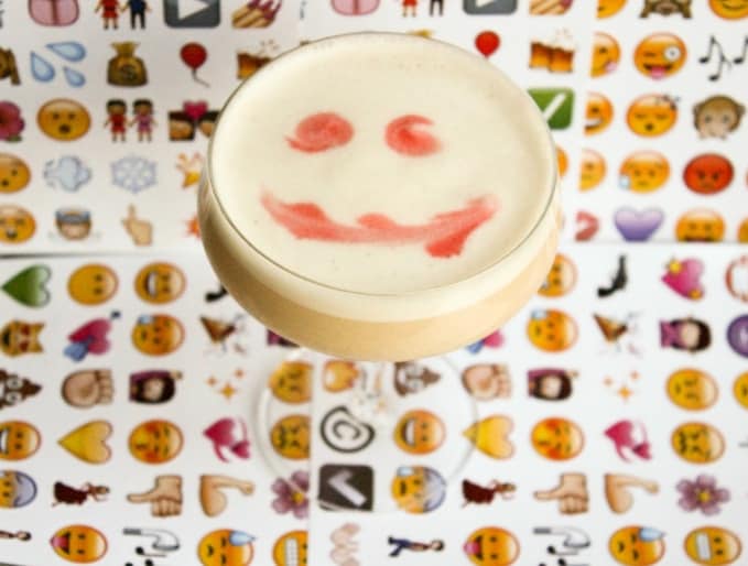 Also, I clearly need a lesson in bitter designs but I think the smiley face in this cocktail looks a little mischievous. I have been on a pineapple kick lately and I used it again here. This time it was mixed with coconut and lime to make something I might call a Piña Colada Sour topped with bitters. I did something different here and used a pre-mixed smoothie but you could make your own using apple juice, banana, coconut cream, mango, and pineapple. Let’s smile together and make some emoji cocktails! Which emoji is your favorite?