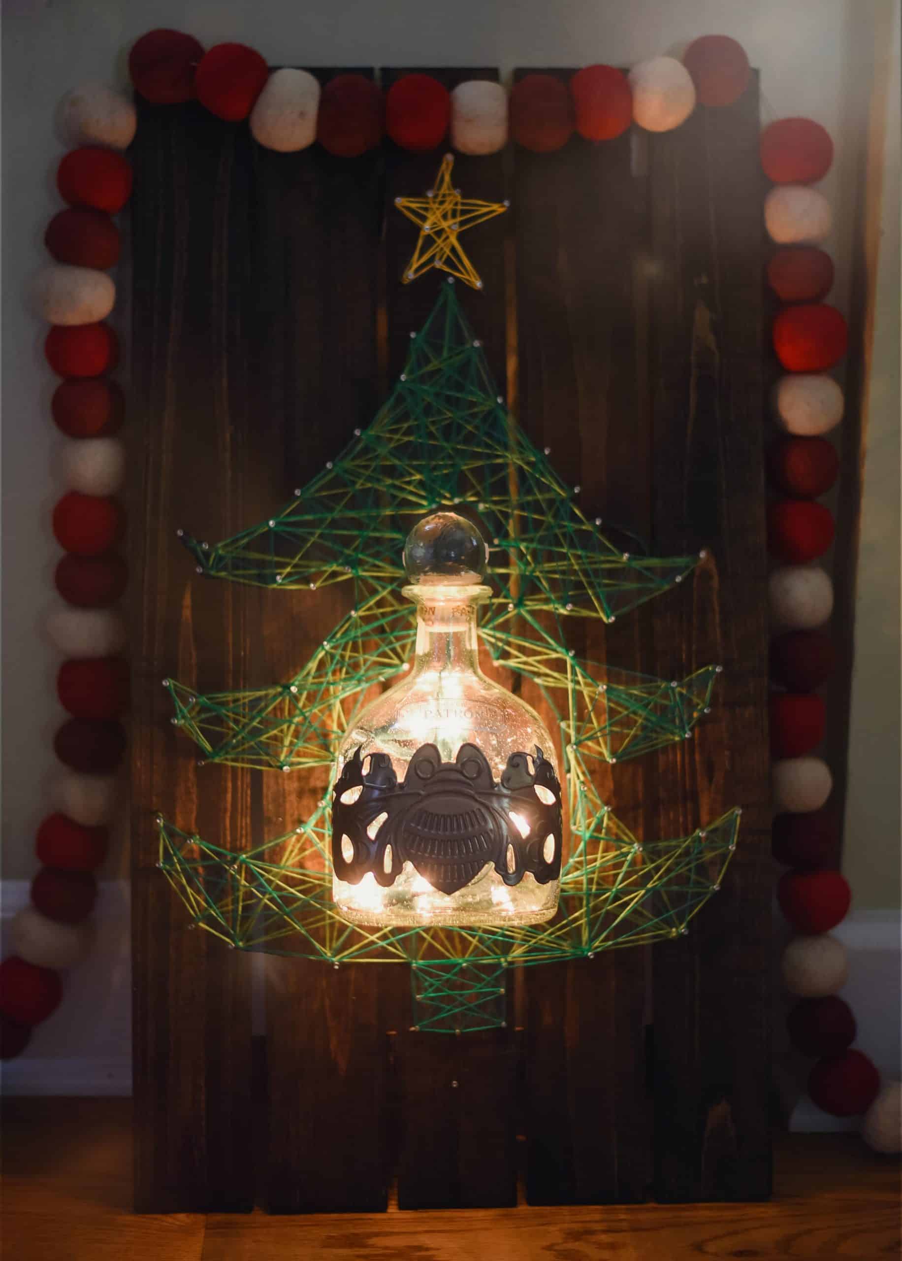 Patrón has just released their first ever 1 liter Patrón Silver Tequila bottle. I am currently obsessed with this bottle and can’t wait to give it to all my friends and family as gifts during the holidays. To commemorate the holiday season Patrón has embellished the limited edition bottle with their signature Patrón bee rendered in pewter. The fun doesn’t have to end simply because the bottle is empty with a bottle like this as it is great when repurposed into festive holiday décor. For example, after an evening in with friends I was left with a lot of cleaning up and an empty bottle in my hands. I decided the cleaning could wait and set to creating a little fun piece of string art with my friends using the beautiful Patrón bottle as the centerpiece. This project was very easy first you pick out a rustic piece of wood for the base. Then you cut a small whole in the center of base for the lights to funnel through so that they can be plugged in. Next you construct the tree by making an outline with nails and stringing the green string in a fun pattern. Then do the same thing for yellow thread to construct the star. After the tree is complete attach the patron bottle filled with lights to the wood. Plug in the lights and you have a awesome holiday piece to decorate your home for the holidays!