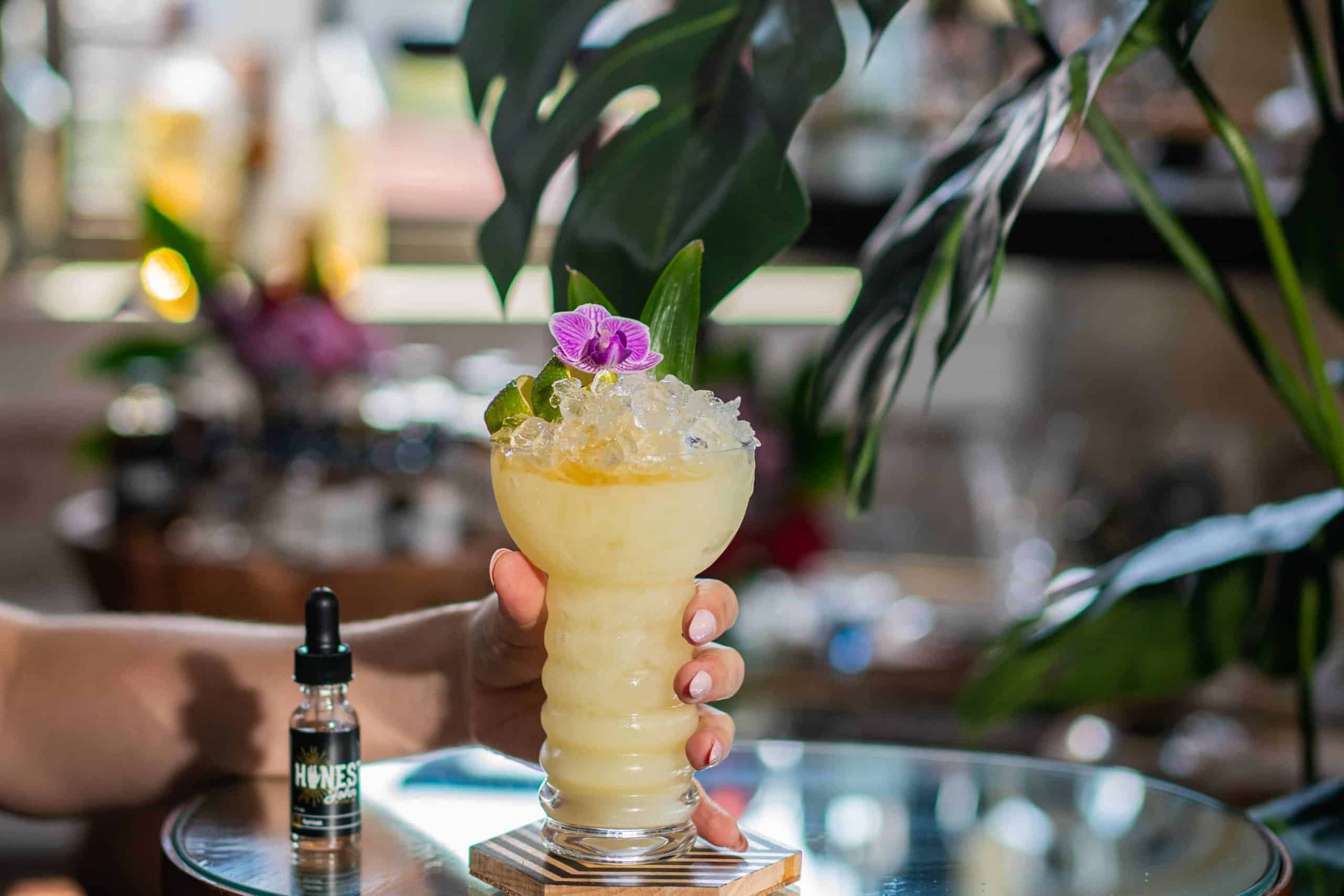 - Garnish with a lime twist, pineapple crown, and edible flower