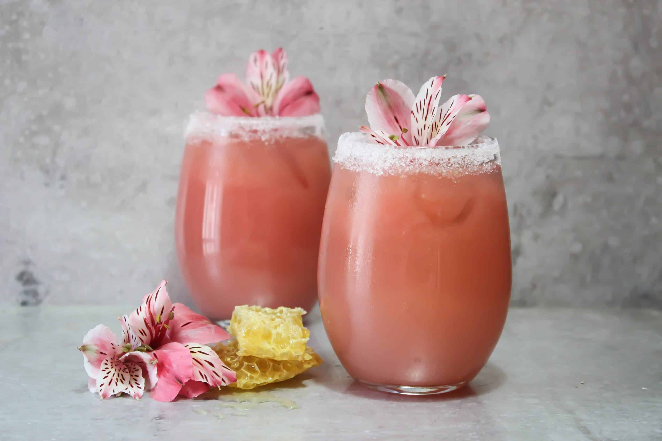 Today I am sharing a twist on the classic Paloma cocktail. I have always loved the Paloma and like to add a touch of freshness to it by putting fresh grapefruit juice in my version and top with some grapefruit soda. I was walking around the market recently and there was a man selling honeycomb acquired fresh from the hive. This inspired me to create a cocktail that featured a hint of honey as a sweetener. Honey is a perfect accompaniment to grapefruit because of the balance it brings to the natural bitterness of the grapefruit. The honey produces a sweet but mellow flavor to this tequila cocktail and the salted rim enhances the flavors within the Paloma even more without being too overpowering. I also enjoyed the effervescence of the grapefruit soda to top everything off.