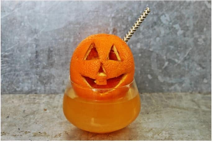 This cocktail was developed when I was searching for the perfect Halloween cocktail and could not think of anything to prepare. I was sitting in my kitchen staring at an orange and wanted to try experimenting. All of a sudden I got an idea to carve the orange to look like a typical Jack O’ Lantern! It was really easy and I decided it would be a perfect garnish for a martini! The highlight of this recipe is the garnish but this is also a really good spin on the typical martini and the color makes it very festive for a Halloween Party or just hanging out at home! You could also make this into a boozy martini punch with a cool orange ice ring!