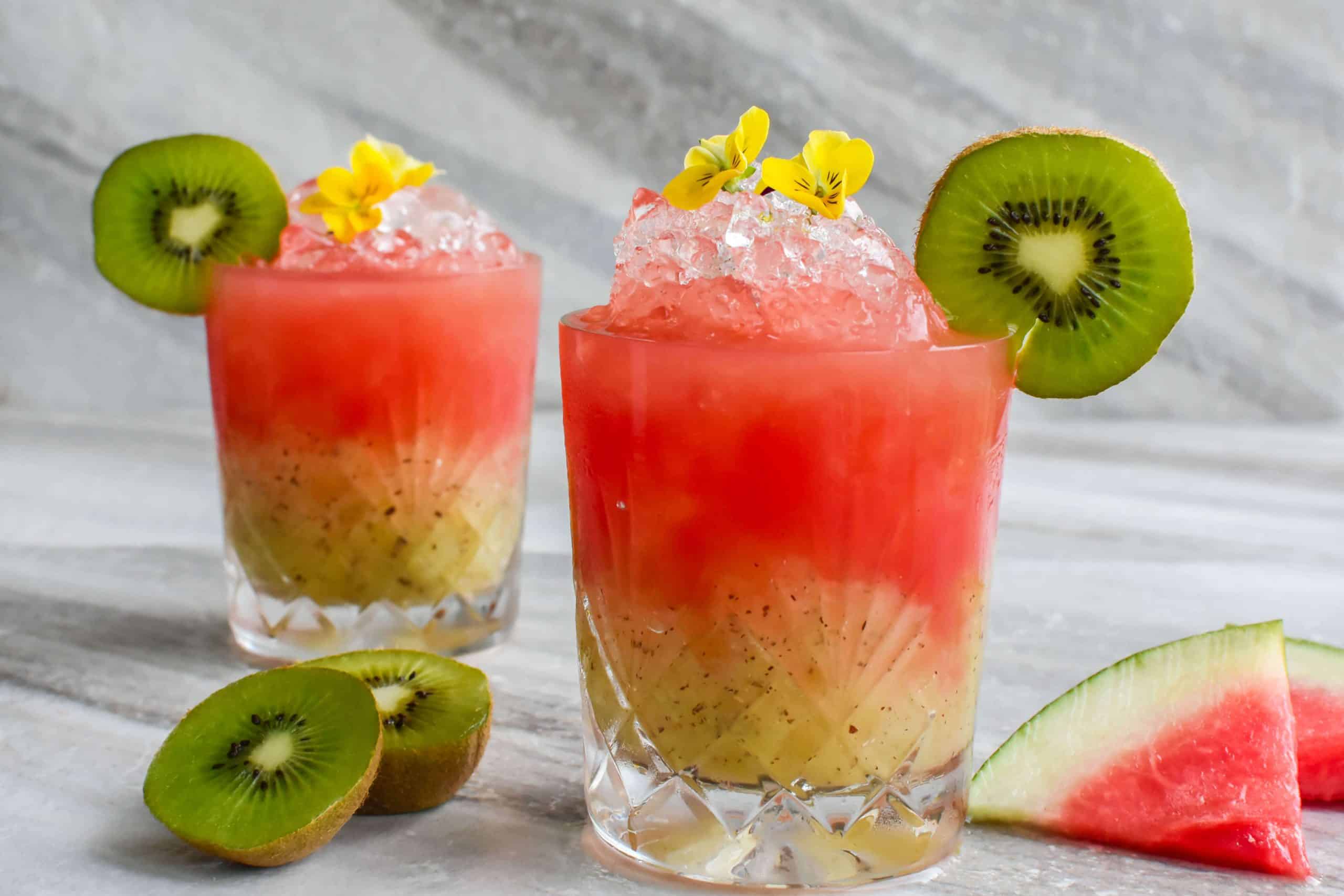 Coming up to the Labor Day Weekend I really wanted to put together something refreshing and light because I absolutely love day drinking but want to make sure I last the entire evening also. This Kiwi Watermelon Bramble is perfect with fresh, “healthy” ingredients that everyone will love and it also works well without any booze at all so if some people aren’t drinking they don’t have to miss out entirely. The addition of the agave syrup from Monin was to give a great earthy flavor, which balances out all of the fresh fruit and citrus notes.