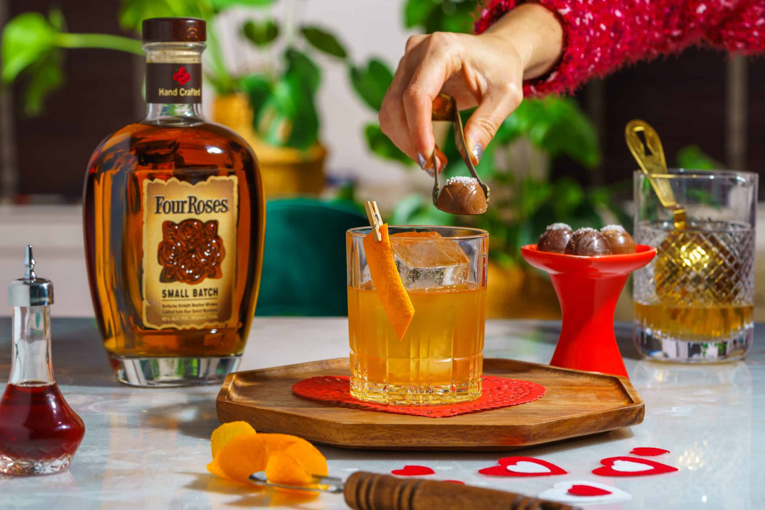 I recommend picking up a bottle of Four Roses Small Batch and some Chocolate Truffles ASAP to make this cocktail! Four Roses is something I have been stocking in my home bar for years & I love the versatility of sipping it neat or mixing it up in a cocktail. It’s a bottle that I always recommend. Plus it’s the perfect Valentine’s Day gift for yourself or your Valentine.