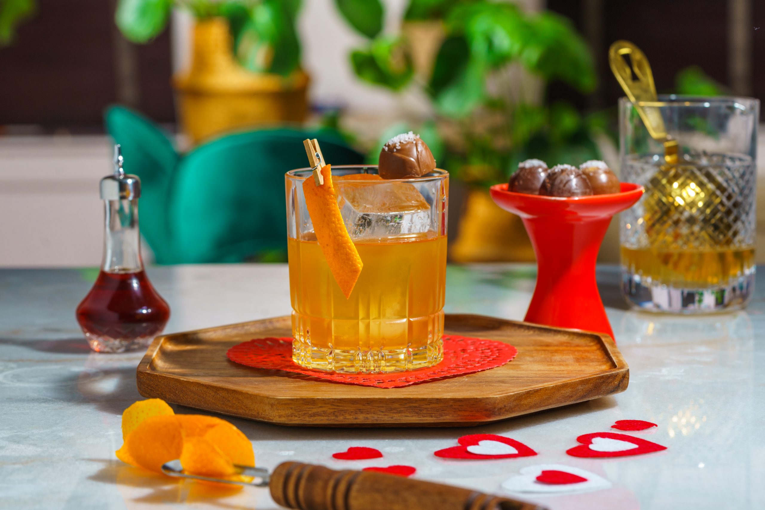 - Garnish with an expressed orange peel and salted chocolate truffle