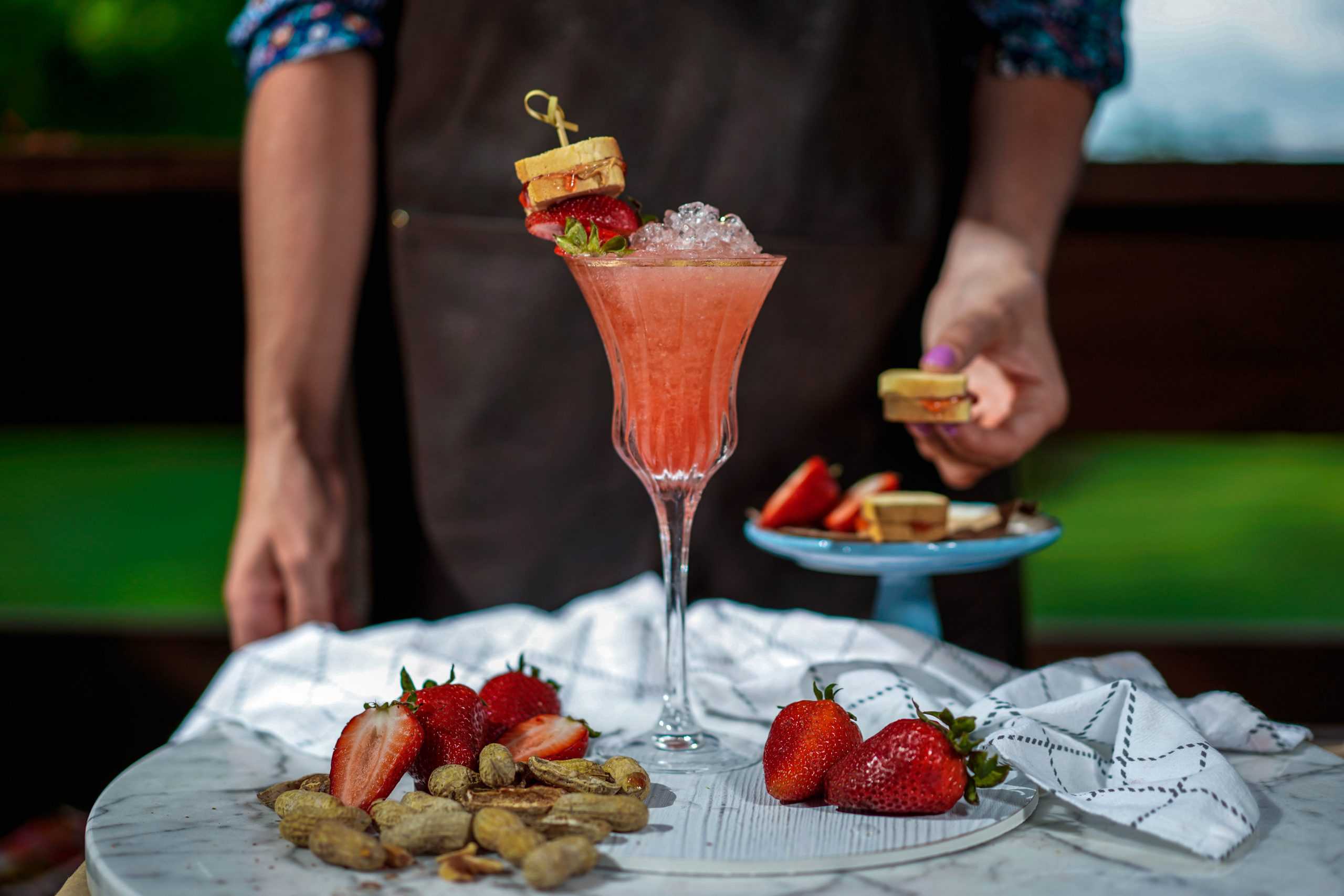 5. Garnish with fresh strawberries and a miniature PB&J sandwich