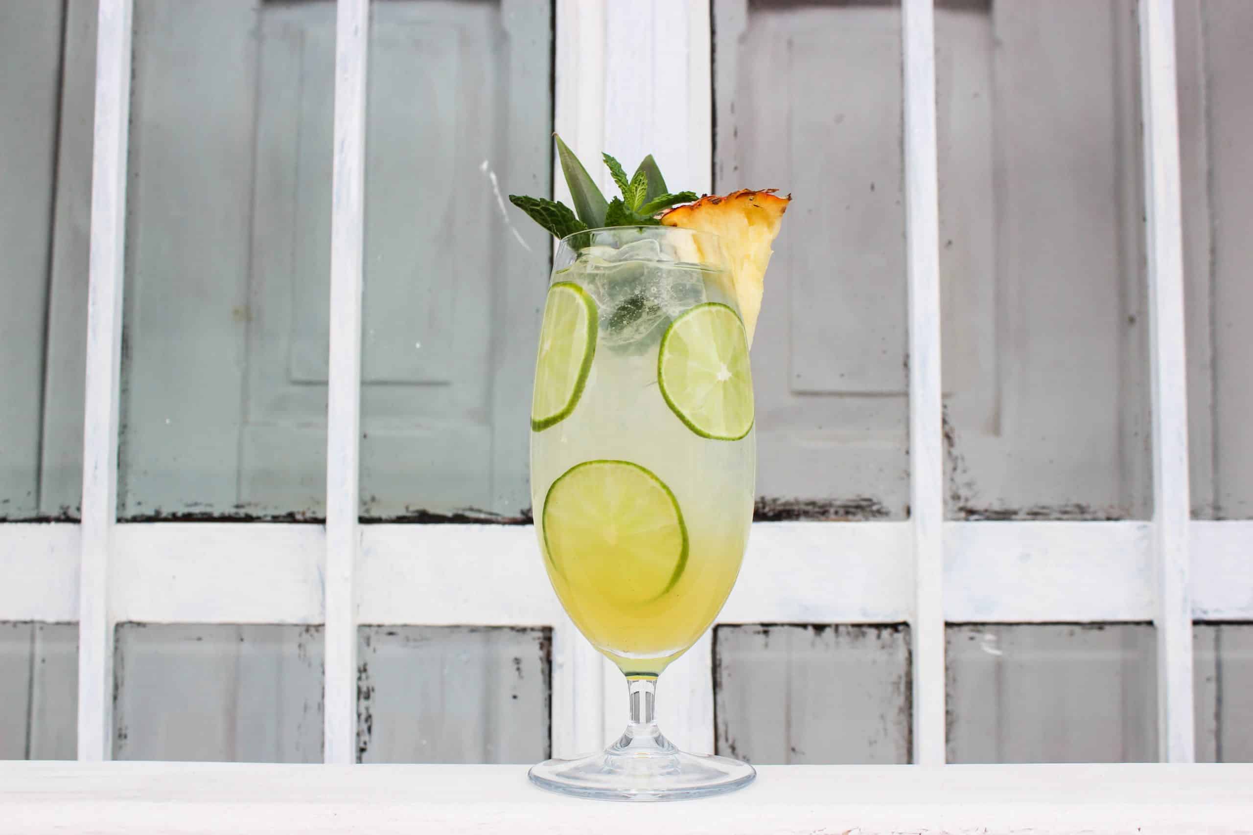 - Garnish with lime slices, pineapple slice, mint, and pineapple leaf
