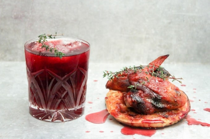 Pomegranate and Raspberry Jam Bourbon paired with Chicken Wings and Waffles with Pomegranate Syrup