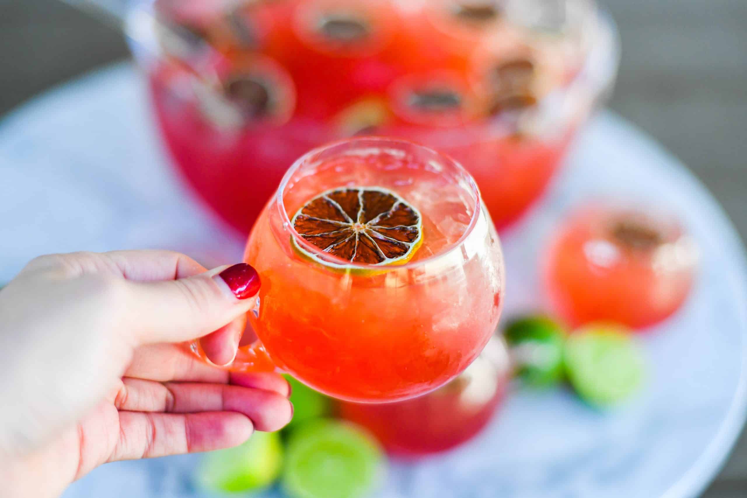- In a punch bowl, mix together tequila, lime juice, pomegranate juice and agave nectar