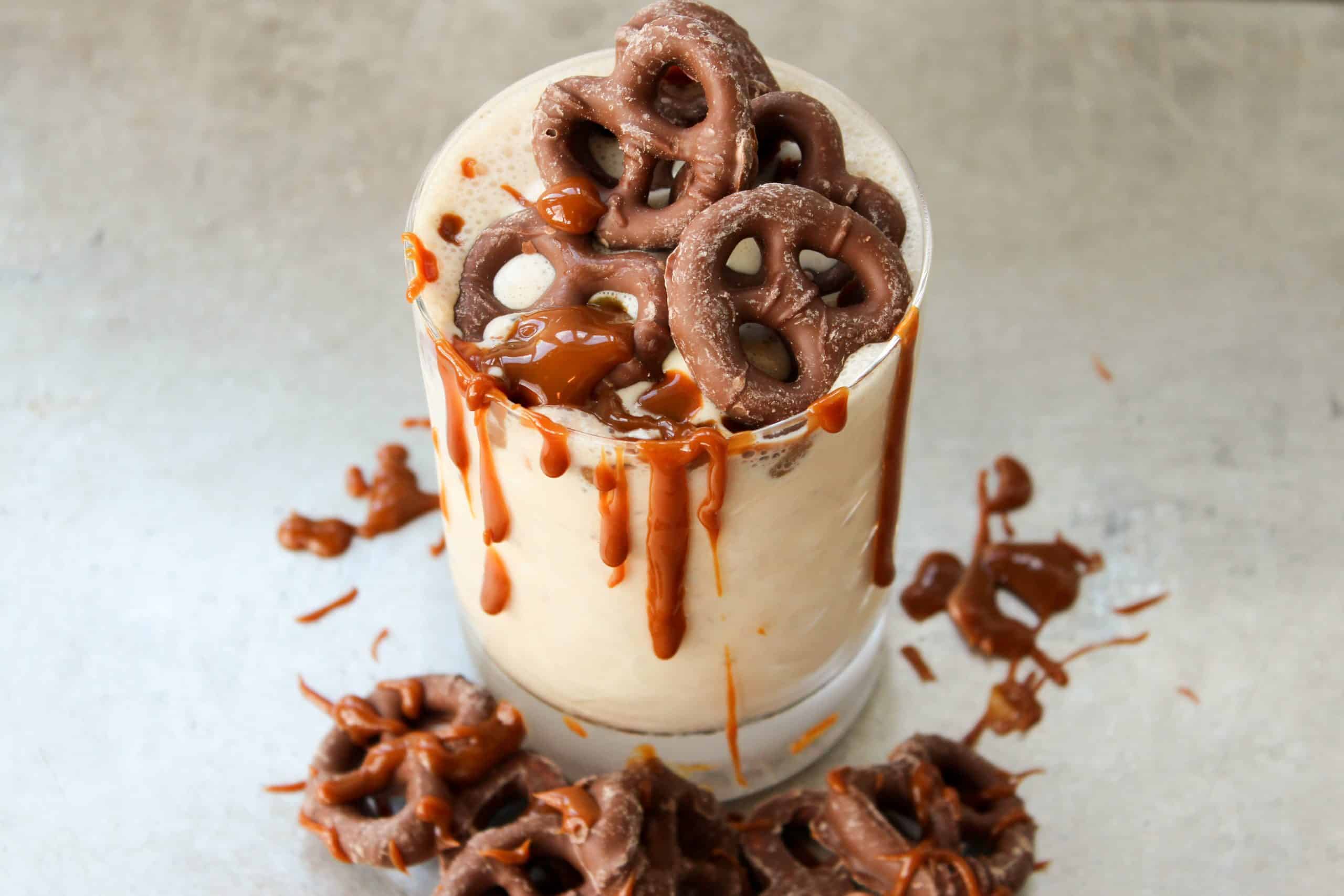 - In a blender combine Wild Turkey bourbon, ice cream, dulce de leche, milk, and chocolate covered pretzels