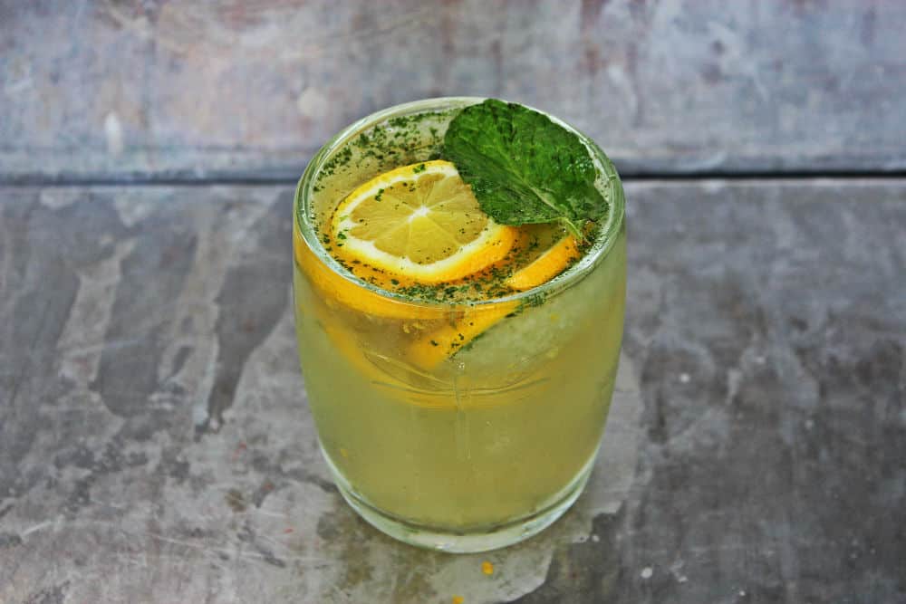 - In a blender combine cider, lemon juice, lemon zest, ice, Luxardo maraschino liqueur, and mint leaves