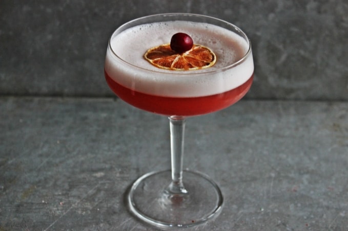 I am loving the tanginess of cranberries in my cocktails lately and the smokiness of The Black Grouse rounds out this cocktail for a perfect spicy flavor. I used an egg white in this cocktail and it is pretty easy to do. Shake all the ingredients together and then add ice and shake again! A simple formula for a drink that looks like it took a ton of effort to make. I garnished this drink with a Simple and Crisp dried lemon crisp which adds a understated elegance to this cocktail. This recipe is easy to double and make two at a time if you are playing bartender for a group! Make this smoky cranberry sour and impress your guest!