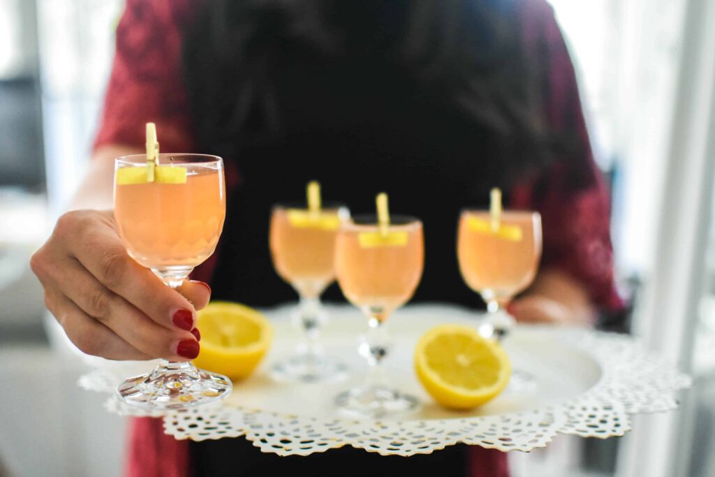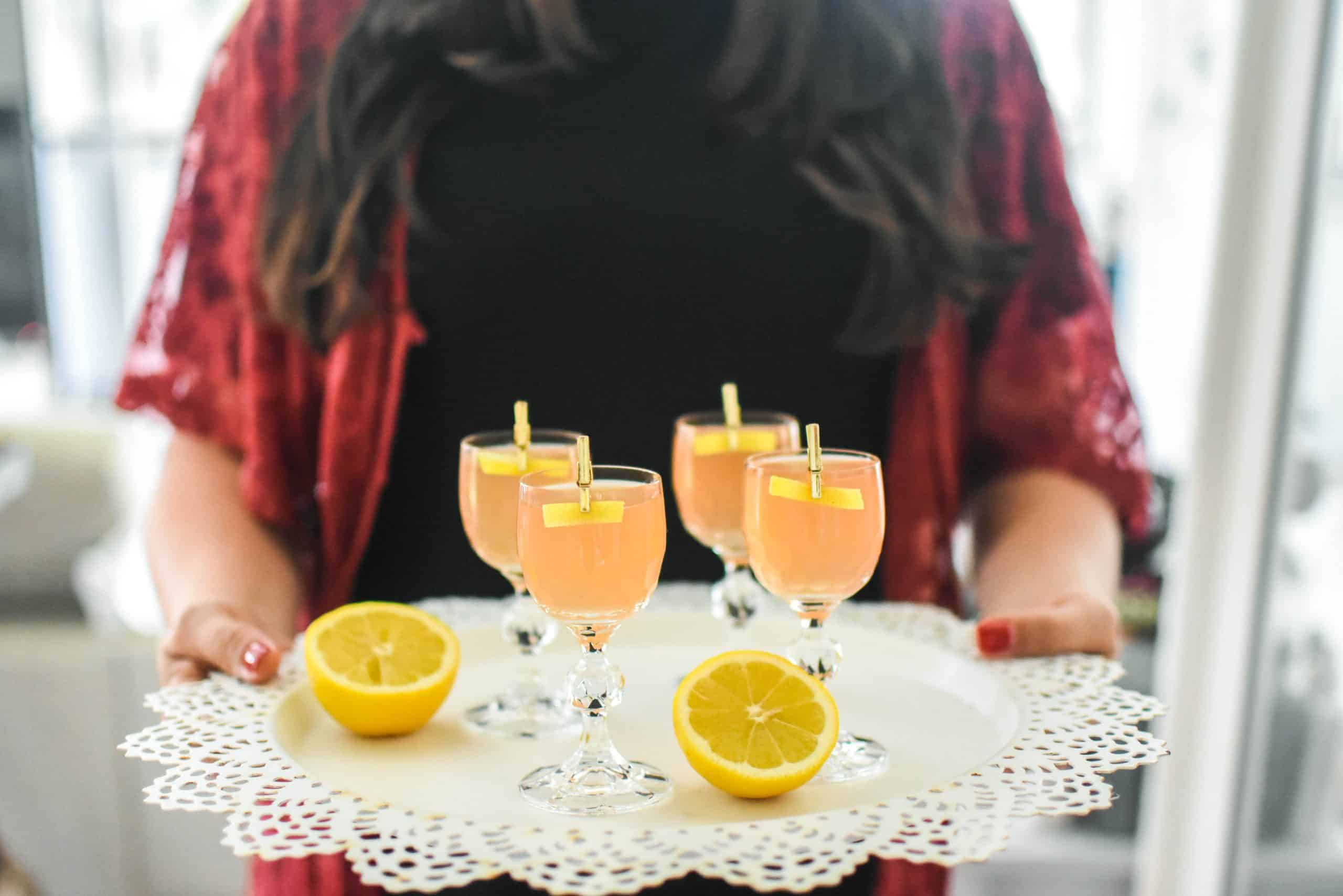 When hosting a get together this holiday season there are some great tips for making your party stand out amongst the rest. It is especially important to make a great first impression so when I’m on my game I serve welcome cocktails to all my guests as soon as they walk in the door. To make it easier they can be batched up and are not designed to be full cocktails but just a little something people can sip on as they greet everyone else. These delicious welcome drinks are made with sloe gin, lemon juice and Monin Pure Cane Syrup then topped off with Champagne.