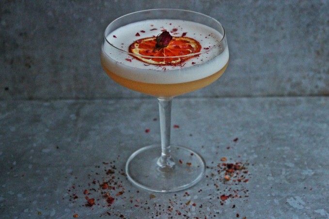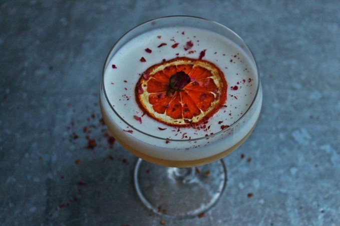 Garnish: Simple and Crisp dried orange crisp and dried rose petals