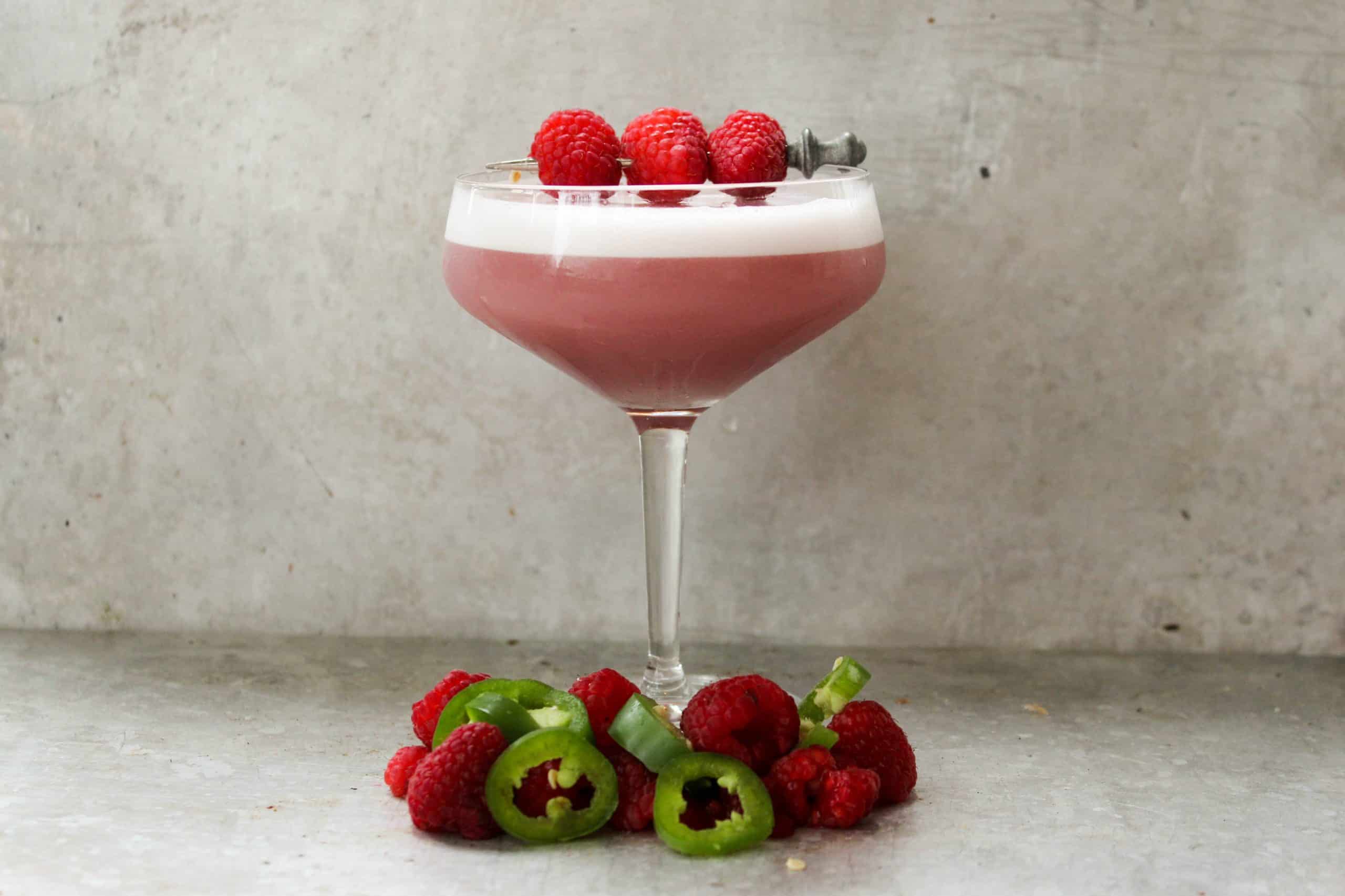 I am on a kick! Today I am sharing another raspberry gin drink! This drink is a twist on the classic cocktail Clover Club Cocktail. I have started with an amazing gin called Bluecoat. I am using their Barrel Reserve that is finished in American Oak Barrels. To this classic cocktail I have added some spice to kick it up a notch in the form of jalapeño simple syrup. This adds a little spice to the cocktail without sacrificing the flavor and enhances the flavors of pepper notes in the barrel-finished gin.