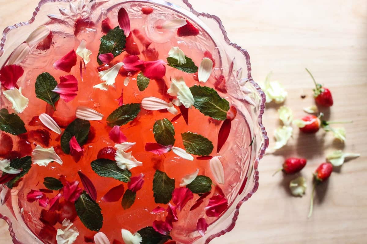 I am a huge fan of punches when serving a big crowd. You literally only need a few supplies and then pour everything into a bowl with ice then serve. It is the best entertaining secret that I have for cocktails and parties. Usually for low-key parties I will serve a punch that only needs 3 ingredients booze, sparkling wine, and a sweet juice. This 3-part combination is so easy that it will be ready to go in a blink of the eye. I also add some fresh fruit and edible flowers to make it look very beautiful. For this punch I added a couple more ingredients like the strawberry puree for a more seasonal and fresh flair as well as limeade instead of fresh lime juice for convenience. This recipe has the typical mule ingredients including ginger beer and vodka. Make this easy and fresh punch!