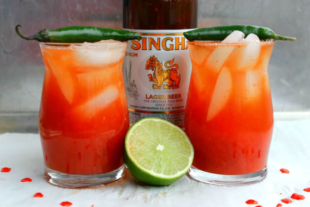 It’s super dark and rainy in Seattle and all I can think about is being somewhere tropical! I was reminiscing about that time I went to Thailand and it was the perfect tropical escape. I started thinking about my trip and decided to make a Bloody Mary inspired by Thai flavors. Not only does this Bloody Mary have sriracha chili sauce it also has a Thai drinking staple; Singha beer. This Bloody Mary is great for a post weekend hangover because it is spicy and boozy.