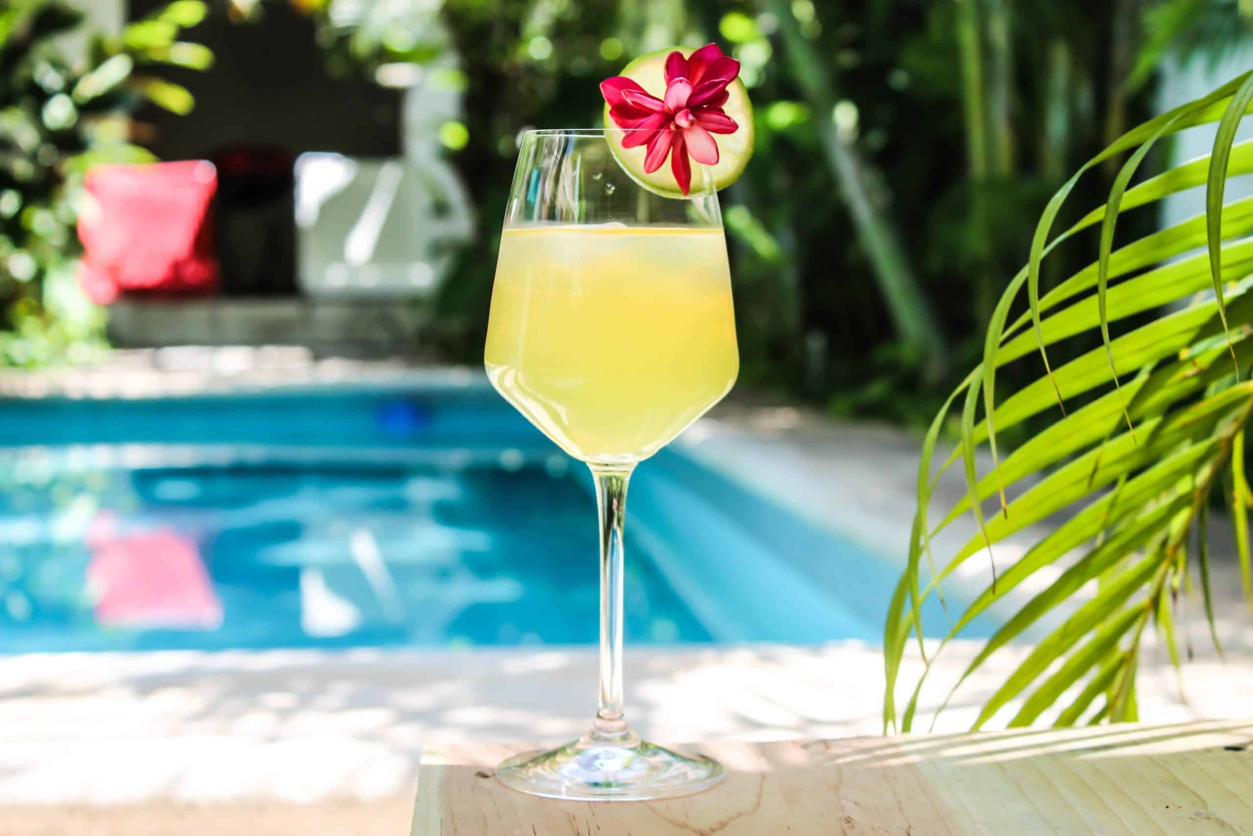 Garnish: Lime slice and tropical flower