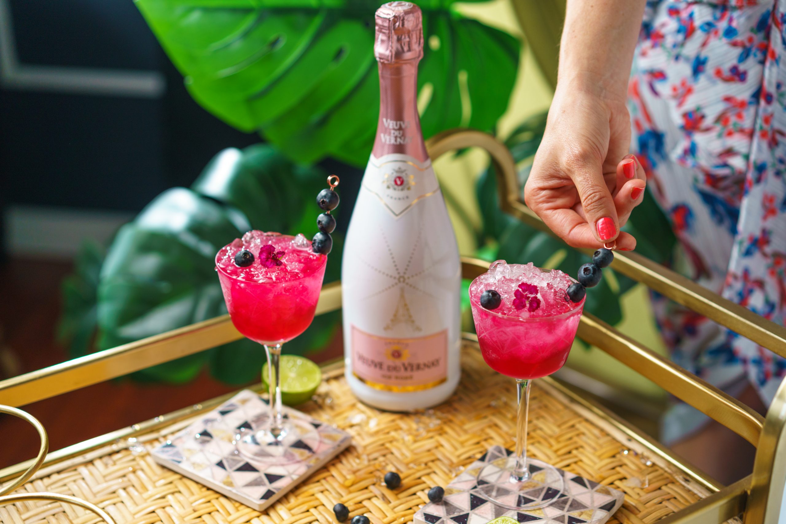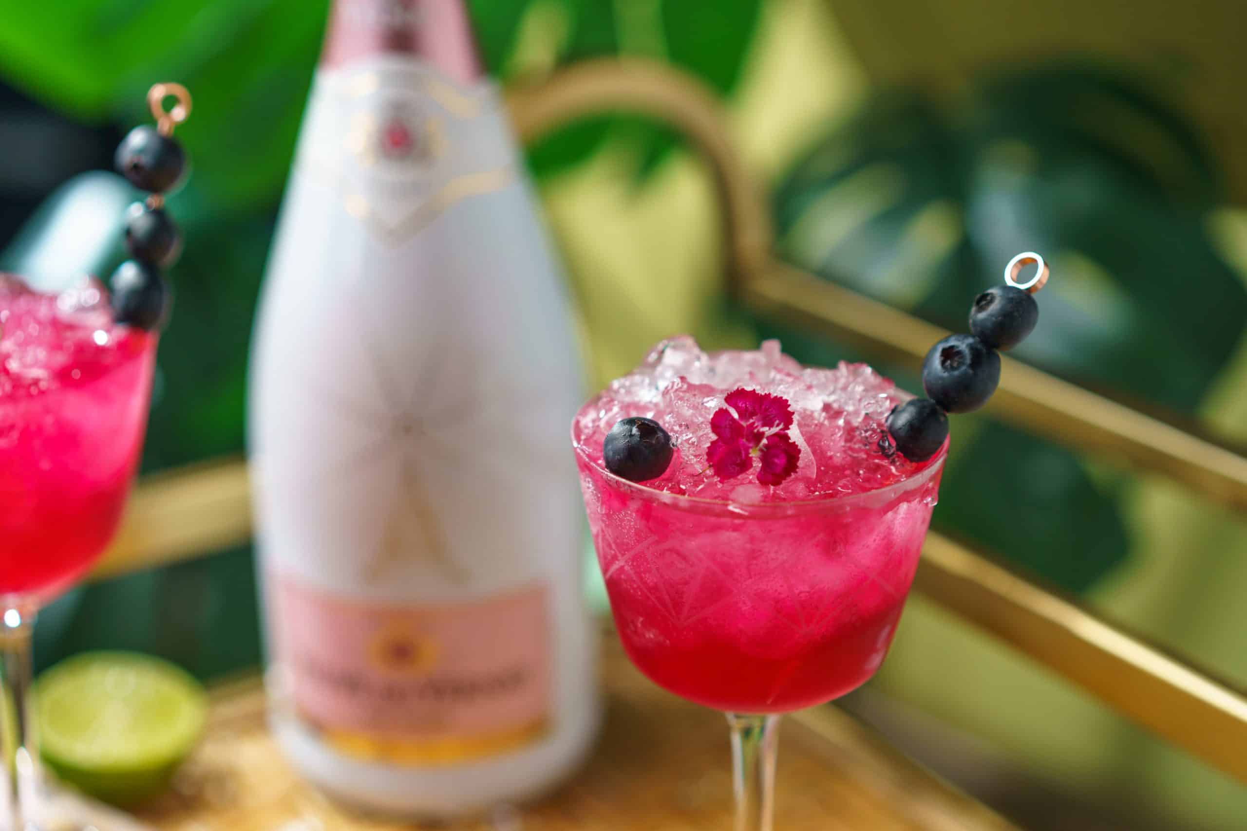 Is it HAPPY HOUR yet? I have the perfect cocktail for any occasion; the Sparkling Vodka GIMLET, featuring Veuve du Vernay Ice Rosé. Y’all already know blueberry syrup is one of my favorite ingredients, so I knew I had to create a fun happy hour cocktail to enjoy all summer long that is enhanced with the flavors of VdV Ice Rosé. VdV Ice Rosé is full of red fruit aromas & has a gorgeous pink color. It’s perfect to sip on with friends or great in cocktails!