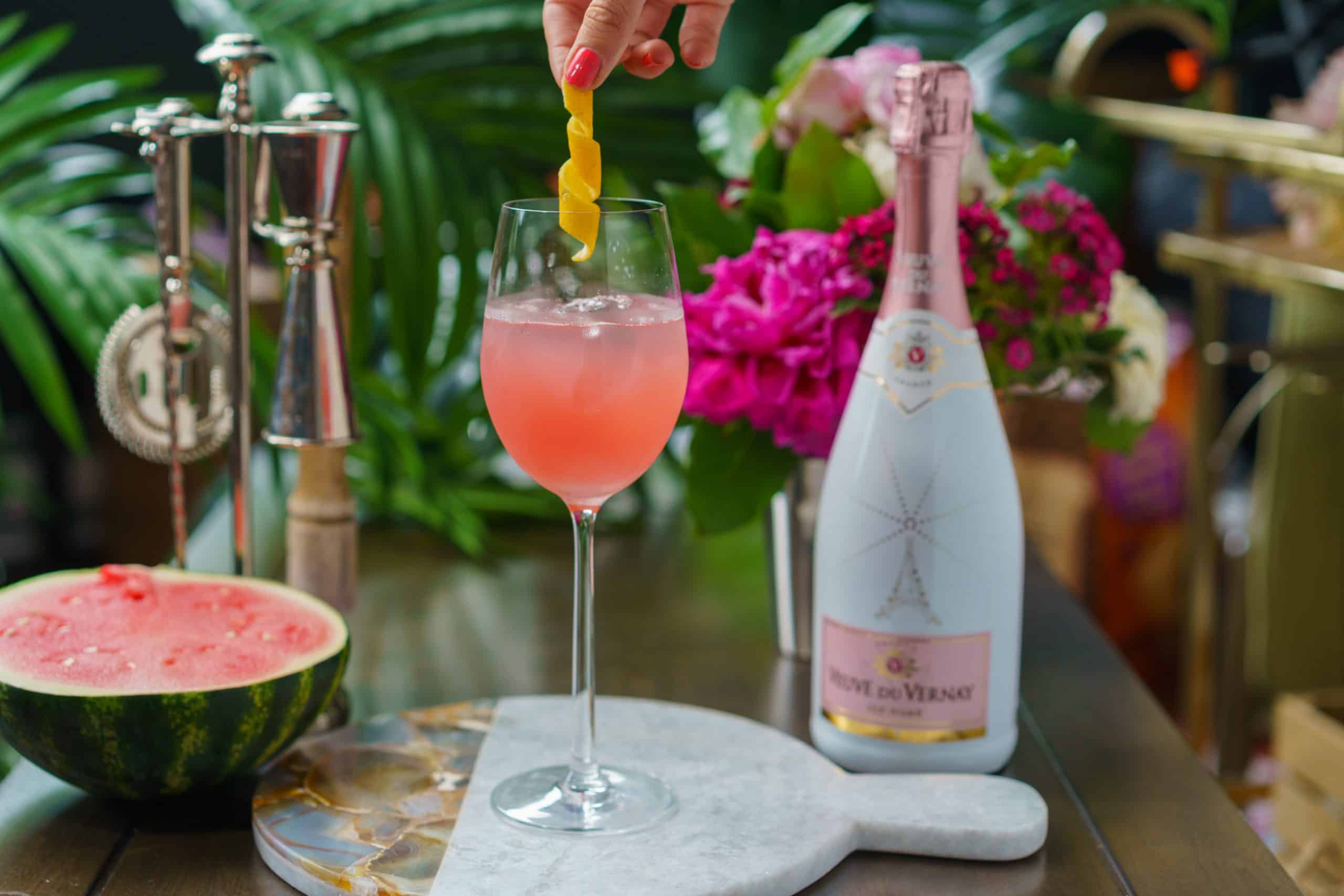 For this recipe, I am using Veuve du Vernay Ice Rosé because it adds layers of flavors to cocktails, and is super versatile. I first tried VdV when I was in France a couple of years ago AND I got hooked. I was excited to find out that it was easily available in the US and I could recreate my trip to France by sipping & using it in my cocktail recipes at home.